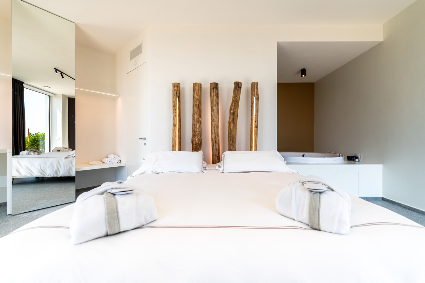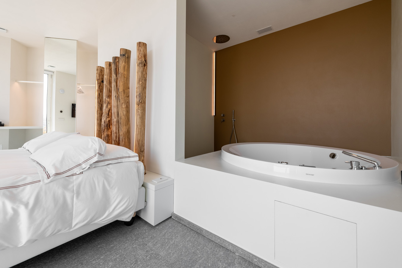 Cerequio Riserva, located next to the Cannubi Riserva suite, is also perfect for aficionados of minimalist design and natural elegance. This suite offers a direct overlook of the breathtaking Barolo valley and its vineyards. The addition of an outdoor terrace adjacent to the entrance enhances the direct and intimate connection with the natural surroundings.